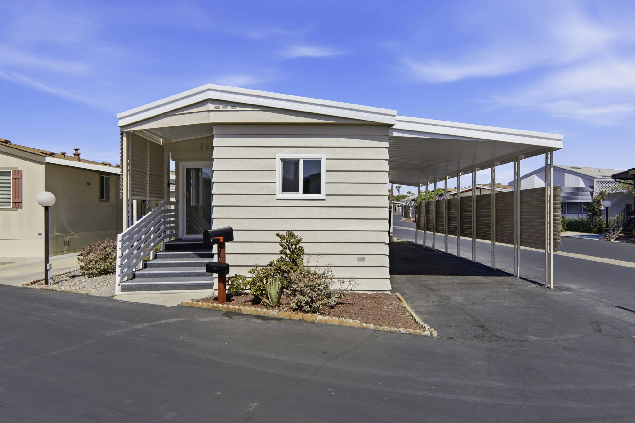 Located in the Rancho La Paz 55+ community, this 1,152-square-foot manufactured home features three bedrooms and two bathrooms with an open-concept layout. Quality interior details include a breakfast bar, central air conditioning, and a dedicated laundry area. Residents have access to a variety of community amenities, including a clubhouse, a swimming pool, a spa, and a library. The property includes a covered carport with space for two vehicles and guest parking nearby. Situated in Anaheim, the home offers convenient proximity to Knott’s Berry Farm, local shopping centers, and major transport routes like the 91 and 5 freeways. Local education is provided by Maxwell Elementary, Ball Junior High, and Savanna High School. This residence provides a low-maintenance lifestyle within a professionally managed park environment that prioritizes resident comfort and social opportunities.